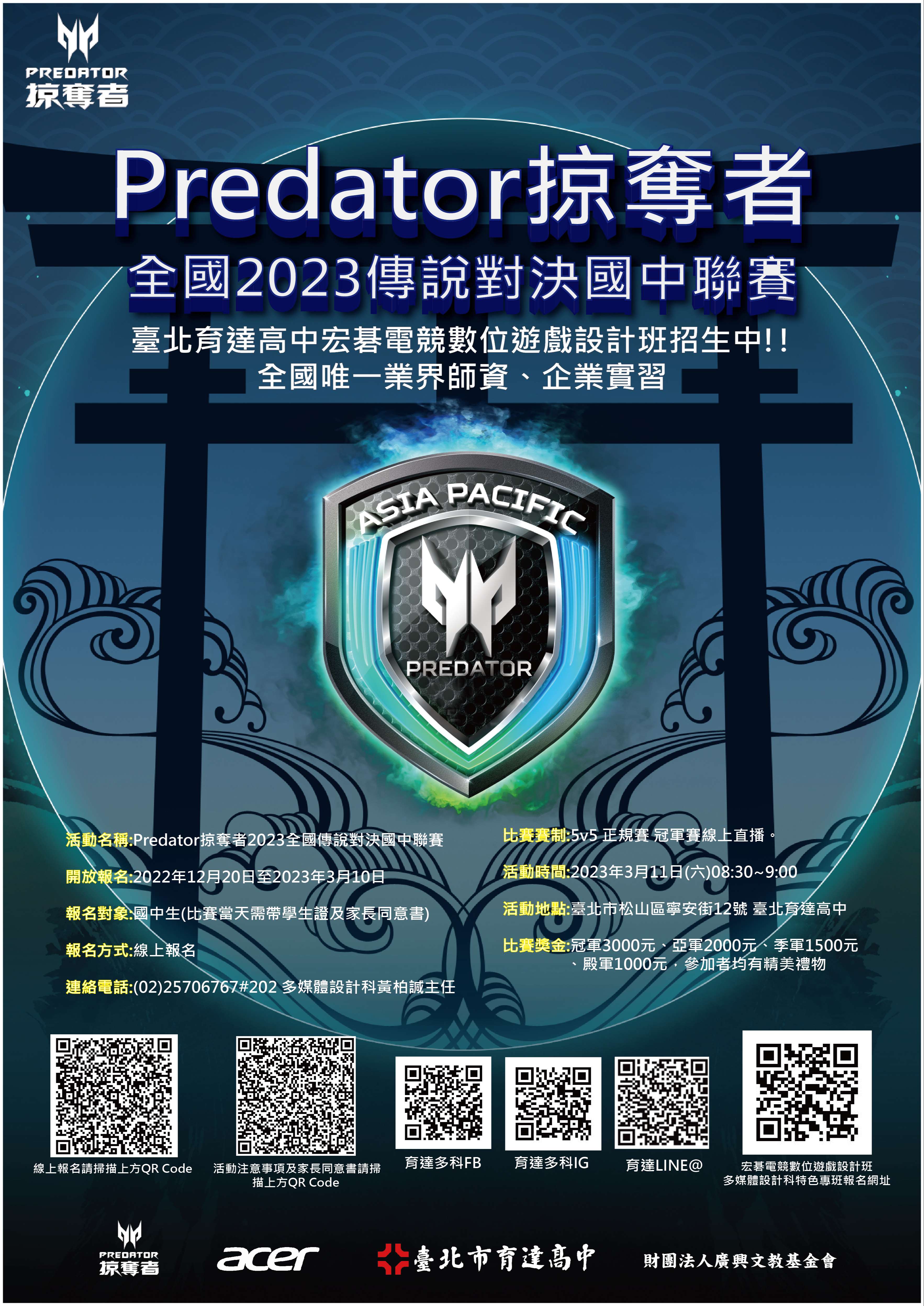 一、宏碁股份有限公司舉辦「Predator掠奪者全國2023傳說對決國中聯賽」,定於2023年3月11日(星期六)比賽。
