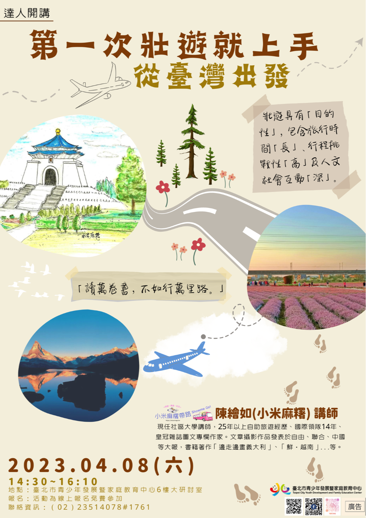 臺北市青少年發展暨家庭教育中心4月8日14:30舉辦壯遊達人開講「第一次壯遊就上手 從臺灣出發」,陳繪如(小米麻糬)老師與您分享壯遊的意義,以及過程中的挑戰,啟發大家思考壯遊方向。活動免費,詳見青發家教中心官網。