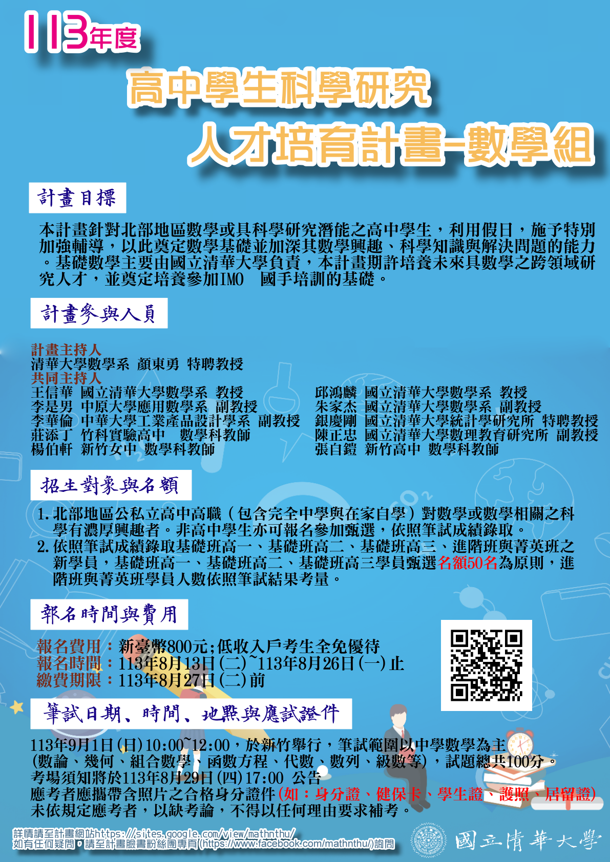 二、報名期間:自 8月13日(星期二)起至 8月26日(星期一)止,詳細資訊請參閱本計畫官方網站報名,網址為:https://sites.google.com/view/mathnthu/。