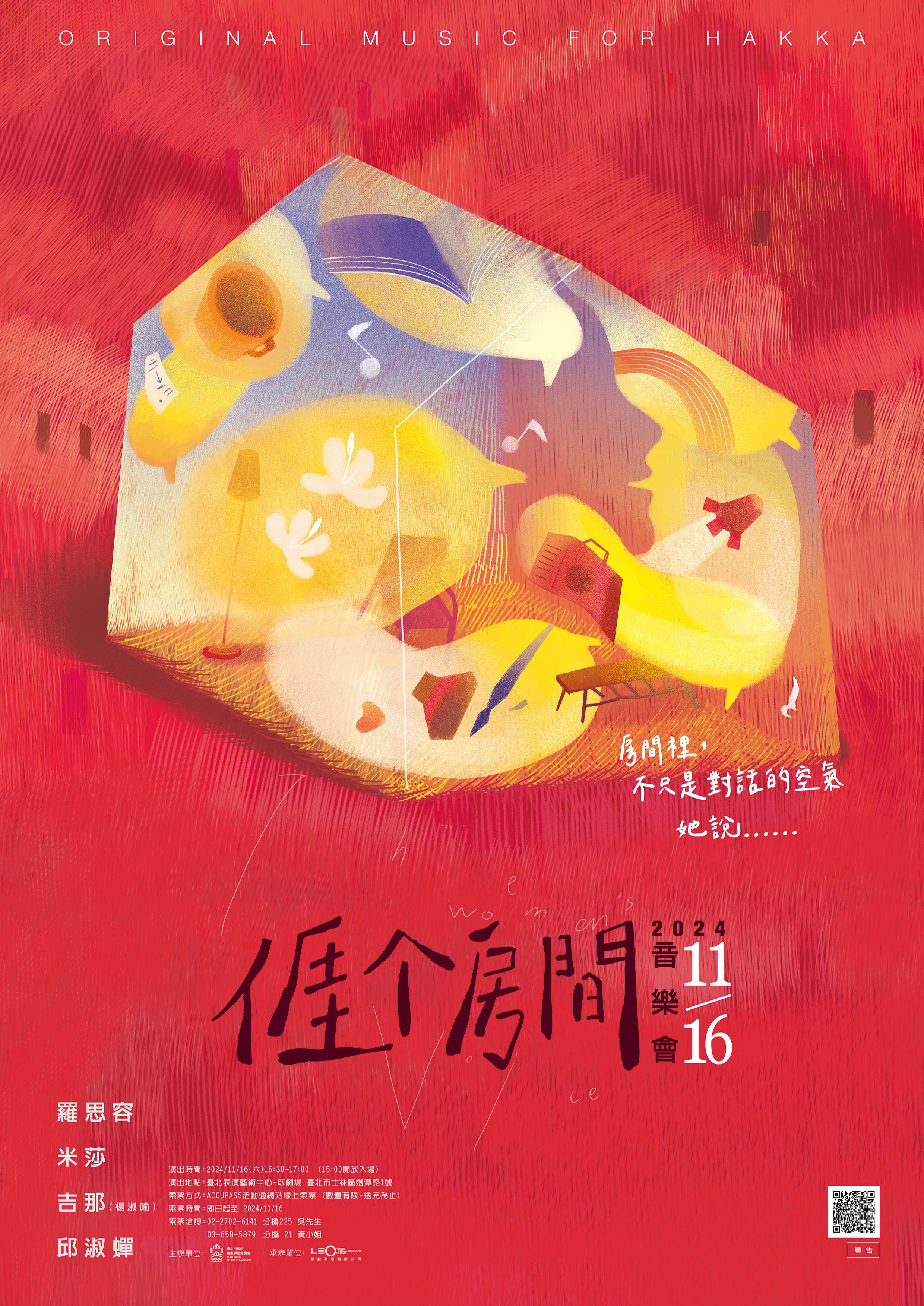 「2024臺北客莊音樂影像故事」案之《亻厓个房間》音樂 會,訂113年11月16日(星期六)下午3時30分至5時,假 臺北表演藝術中心球劇場舉辦