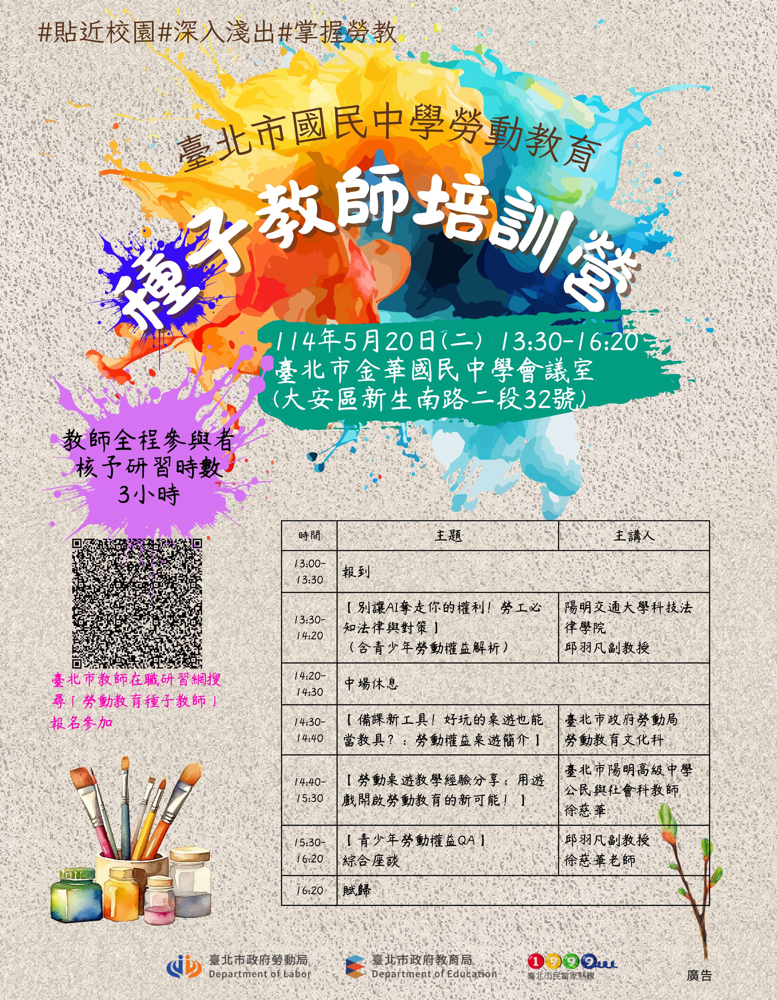 一、本局自105年起,為提升教師勞動知能與推廣校園勞動教育,每年度辦理高中職教師勞動教育種子教師培訓營,並自110年起加入國中場次。113年起培訓內容更強化與108課綱及學校課程的連結,期望協助教師掌握最新勞動知識與議題,深化課程內容,並激發更多元與創新的教學思維;為加強推廣勞動教育並深化與學校之連結,本年度邀請「臺北市國民中學社會領域輔導團」合作,協助提供研習場地及宣傳研習活動等事宜。