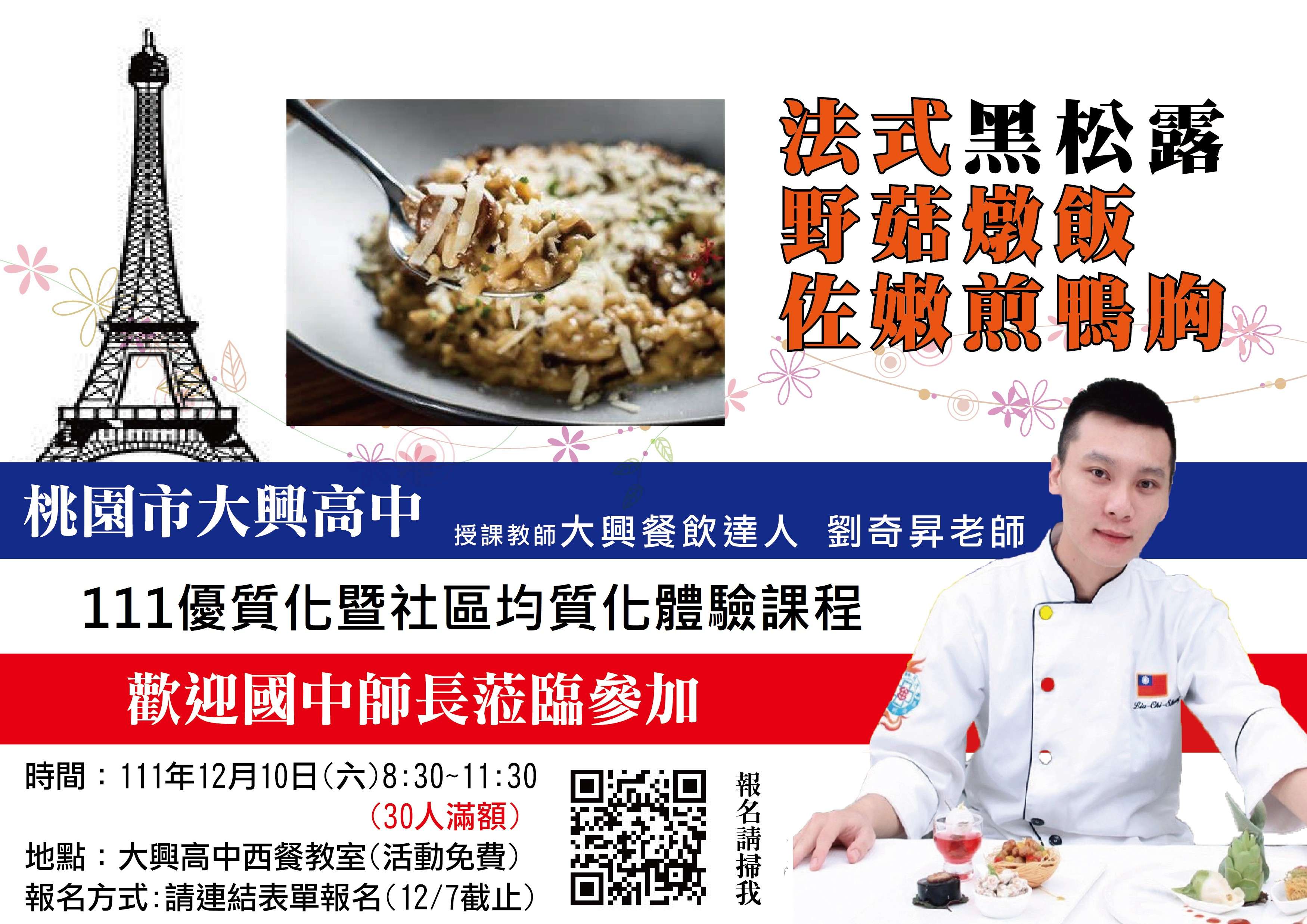 四、地點:上課場地:大興高中西餐實習教室,桃園市大園區永興路142號。