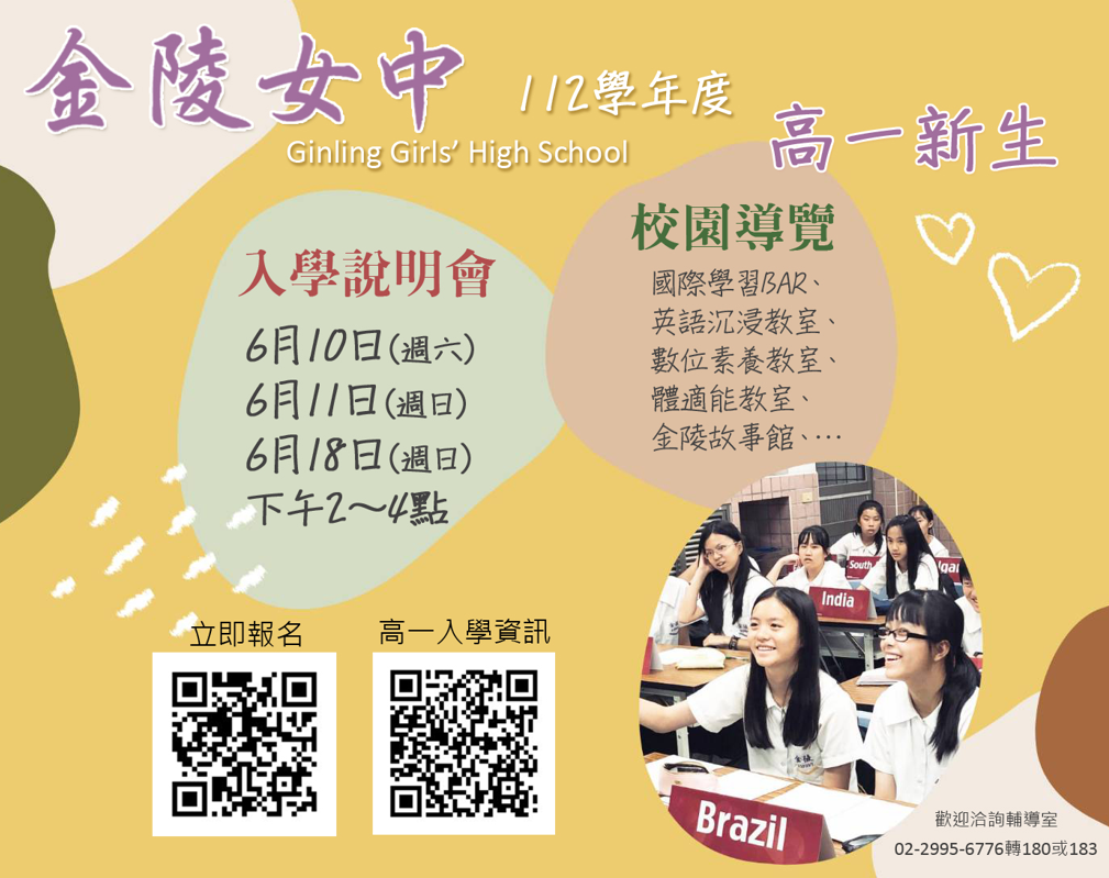 一、本校通過國教署擴增雙語實驗班計畫,設有臺美雙聯學制,並輔導升學美國、英國、澳洲及直升荷蘭阿姆斯特丹大學、英國薩里大學。為提供國三家長及學生,了解金陵教育理念及特色課程,特辦理校園參訪暨說明會,敬請協助公告並鼓勵踴躍報名。