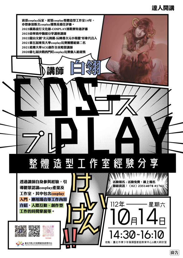 臺北市青少年發展暨家庭教育中心10月14日14:30舉辦達人開講「Cosplay整體造型工作室經營分享」,白翎老師與您分享她經營Cosplay整體造型工作室的心路歷程,以及過程中的體驗。活動免費,詳見青發家教中心官網。