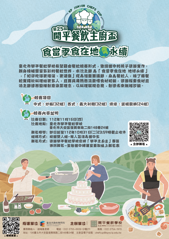 九、相關比賽辦法,報名資訊隨函檢附,詳細比賽資訊請參閱第25屆主廚盃網頁(https://sites.google.com/kpvs.tp.edu.tw/kpvsjcc)或逕洽聯絡人:趙瑞鳳老師,連絡電話:02-2755-6939轉211