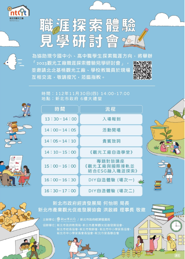 1、邀請職涯探索教育專業學者、觀光工廠領域專家與學校代表進行專題對談,分享觀光工廠與國際接軌並結合ESG能提供職探教育之資源與協助。
