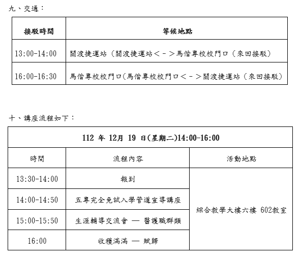 七、因校內停車位有限停滿為止,另備有接駁車(大南客運)在關渡捷運站一號出口來回接送,發車時段請參閱附件,請多加利用大眾交通運輸工具,造成不便敬請見諒。