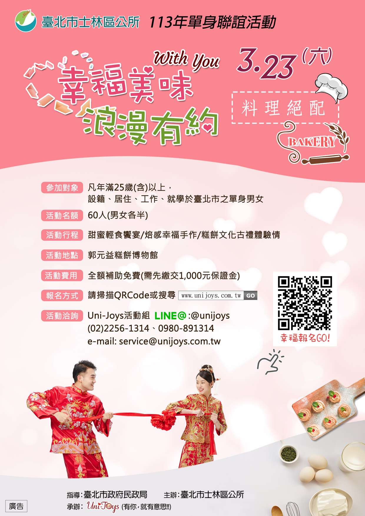 臺北市士林區公所113年『幸福美味浪漫有約』單身聯誼活動,將於113年3月23日(星期六)12時30分至17時,假郭元益糕餅博物館舉辦,活動名額為男、女性各30人,共60人,歡迎年滿25歲(含)以上設籍、居住、工作或就學於臺北市之未婚單身男女踴躍報名參加,詳情請見報名簡章及士林區公所官網最新消息或電洽(02)2882-6200分機6502宋小姐。