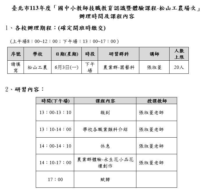二、本校於6月3日下午13:00~17:00辦理臺北市113年度國中小教師技職教育認識暨體驗課程-永生花小品花禮創作,名額為20人,歡迎各校教師報名參加,報名截止時間為5月29日,請上臺北市教師在職研習網報名,課程研習字號為北市研習字第1130521026號。