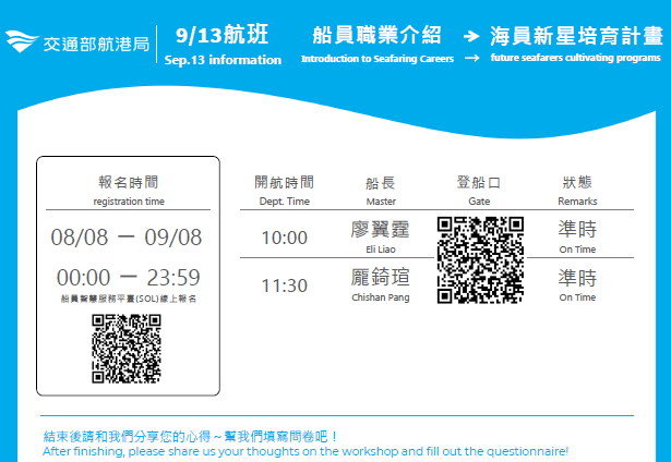 三、欲參加者請至航管局船員智慧服務平臺完成報名、全程參與說明會並填寫問卷調查者將有機會獲得交通部航海局宣導品。