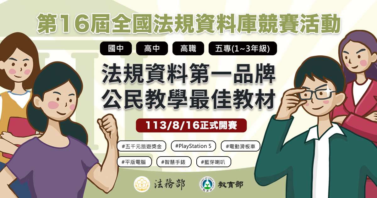 (二)活動方式:運用「全國法規資料庫」融入法治教育相關議題進行教案設計,本屆教案甄選主題為人權法治與性別平等議題、重大修法議題、資訊與網路安全議題其他與法治教育相關議題。