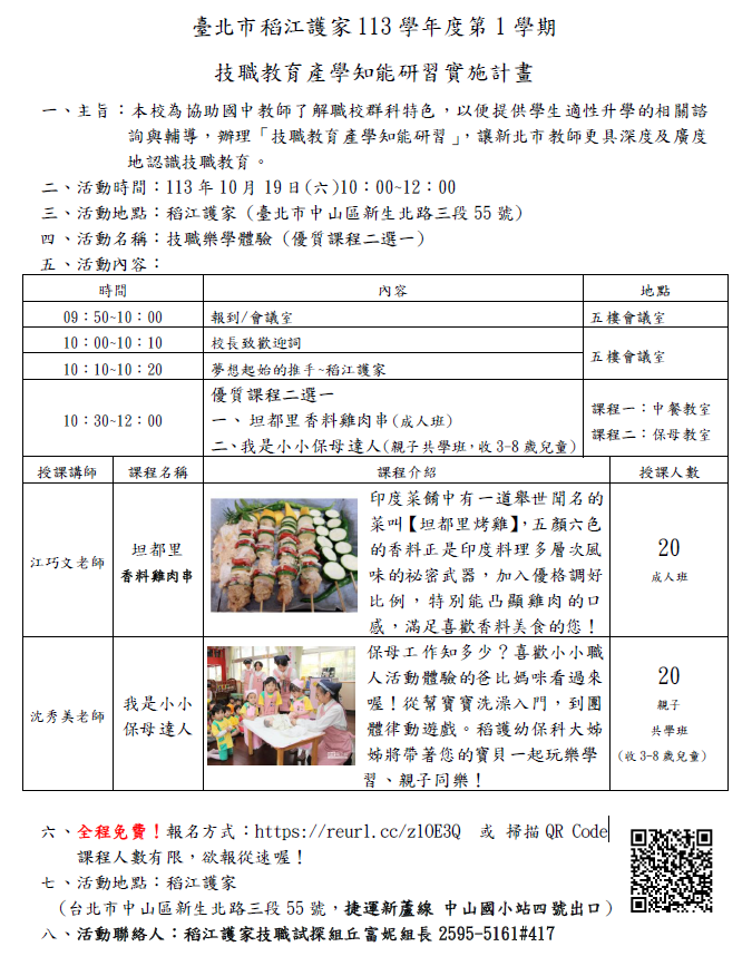 二、本學期於113年10月19日(六)上午10:00-12:00,辦理「技職樂學體驗」活動,開設「坦都里雞肉烤串」成人班、「我是小小保母達人」親子共學班,優質課程二選一。誠摯邀請 貴校八、九年級導師及輔導學生升學相關行政人員踴躍報名參加,全程免費。