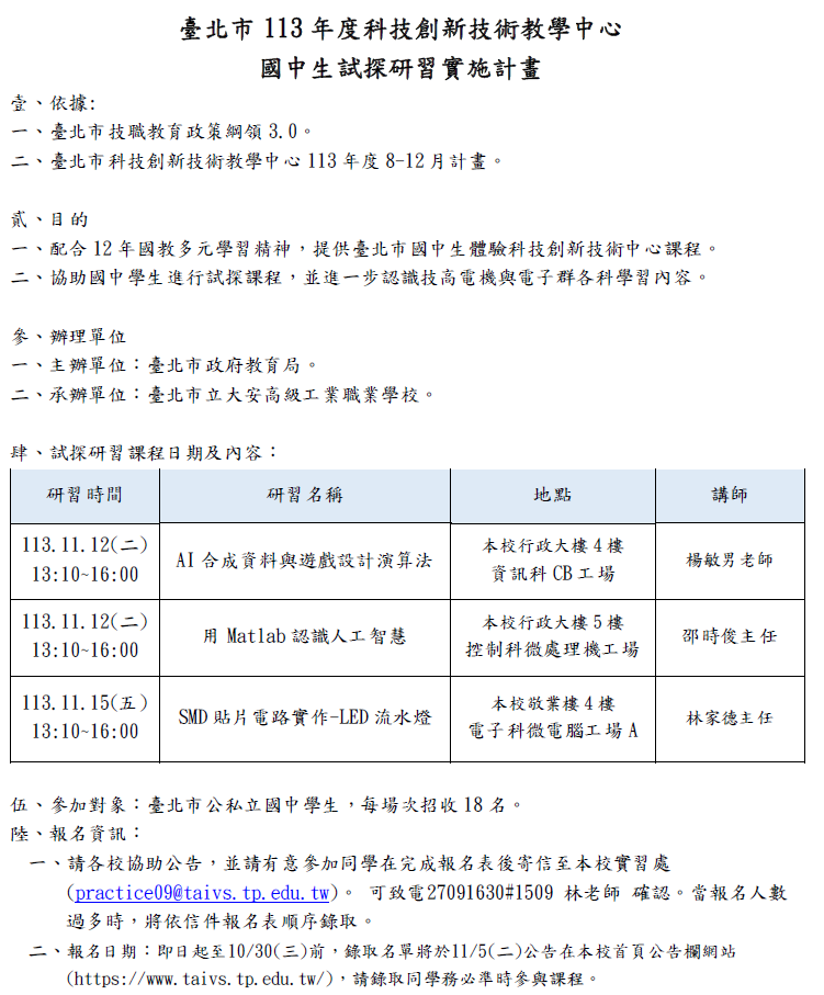 五、報名日期:即日起至10/30(三)前,錄取名單將於11/5(二)公告在本校網站首頁公告欄(https://www.taivs.tp.edu.tw/),請錄取同學務必準時參與課程。