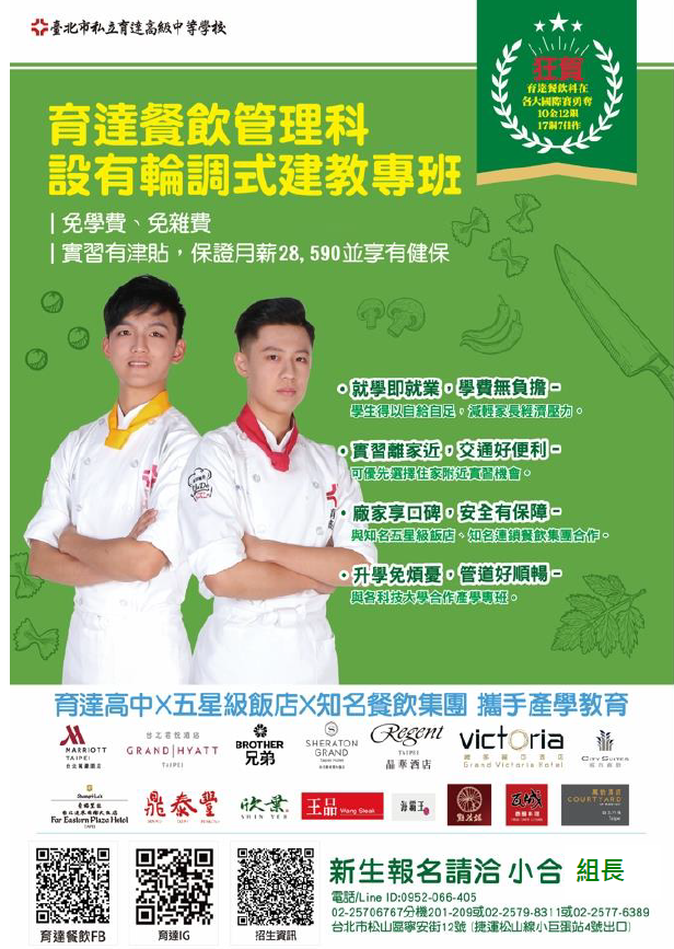 一、本校餐飲管理科與五星大飯店(台北君悅酒店、台北喜來登大飯店、台北萬豪酒店、香格里拉台北遠東國際大飯店、維多麗亞酒店..)與知名連鎖產業(王品餐飲集、鼎泰豐、欣葉國際餐飲集團、瓦城泰統集團、點水樓餐飲..)合作,品牌大有保障。