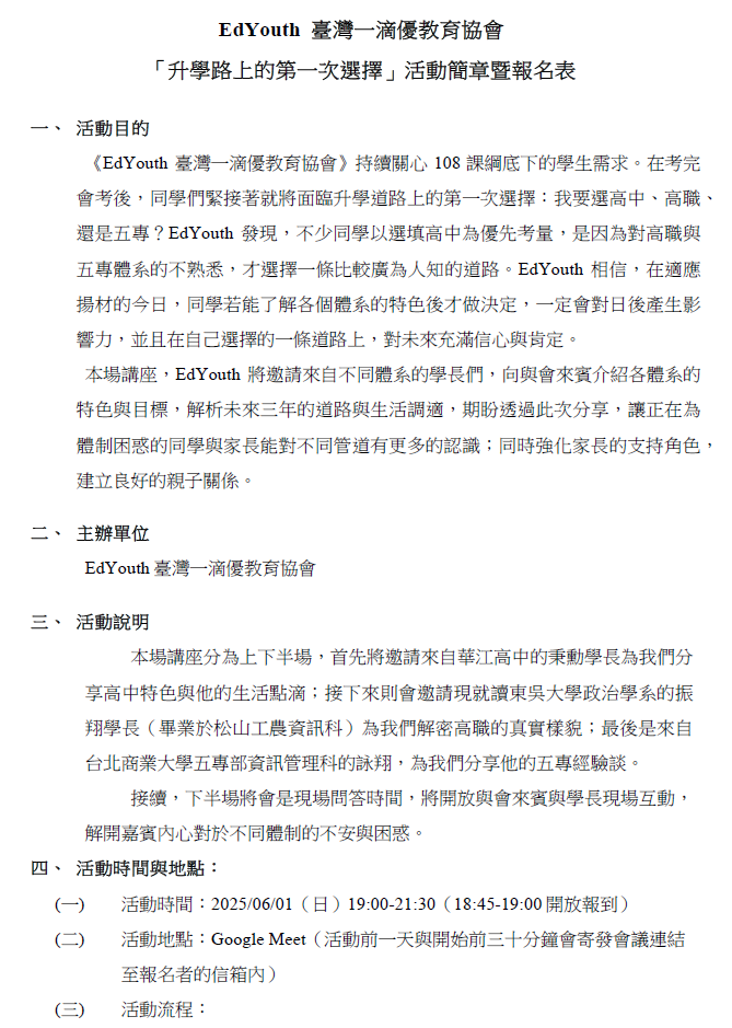二、本活動訂於中華民國114年6月1日(星期日)19時至21時30分,以Google Meet 線上形式辦理。