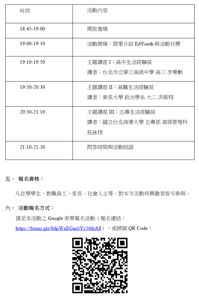 三、欲報名活動,請至以下連結填寫報名表單(https://forms.gle/8dpWaEGmSYc56feA8),或掃描活動簡章所附 QR Code。