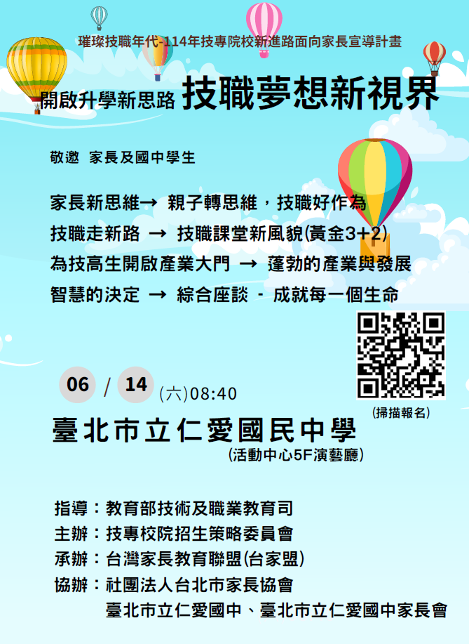 二、旨揭宣導計畫相關說明會臺北市場次訂於114年6月14日(星期六)上午9時假臺北市立仁愛國民中學(活動中心5F演藝廳)舉辦,參與對象為國、高中學生及家長,報名網址:https://forms.gle/iS5aNwo5rrFUGhM36。