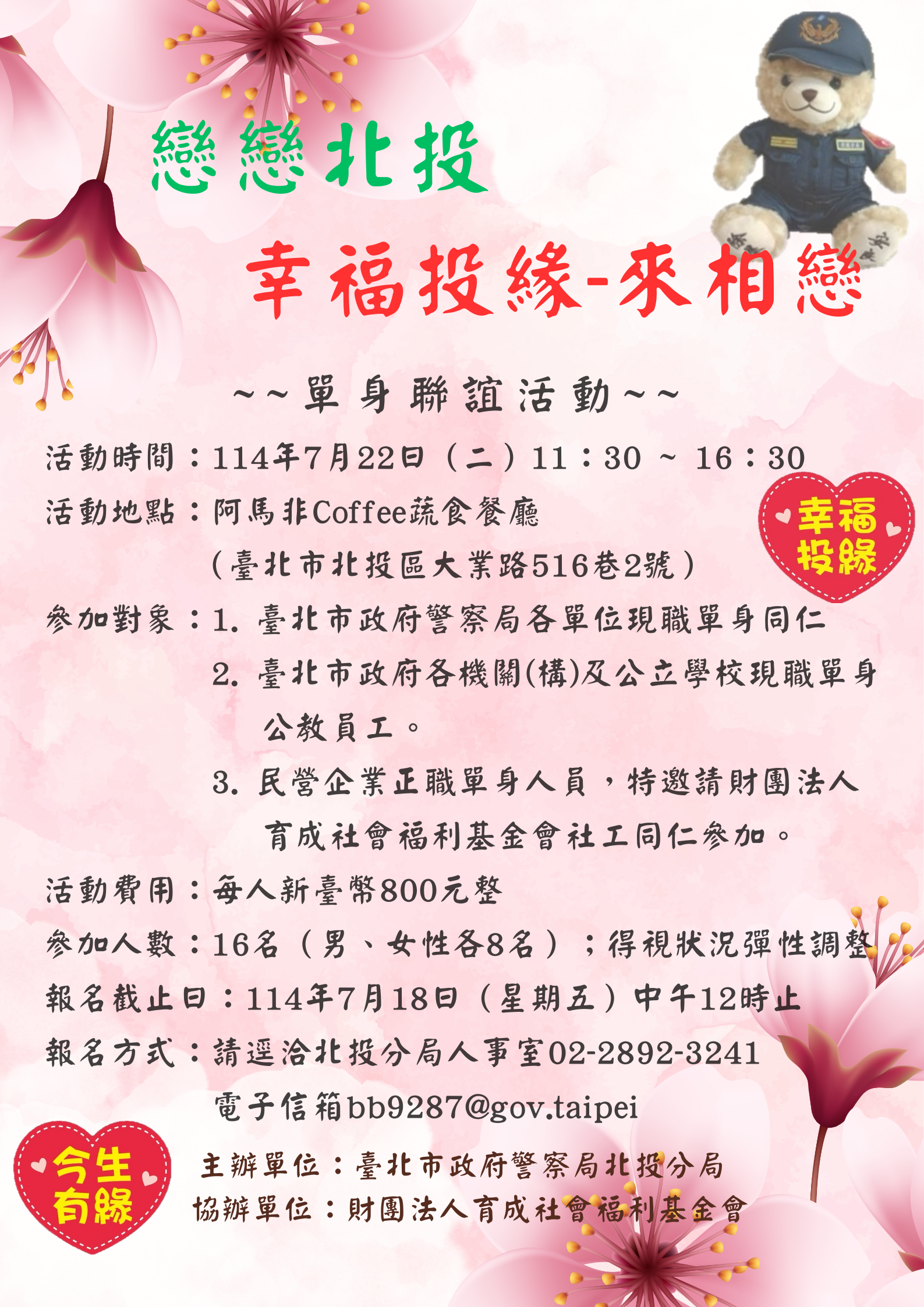 一、臺北市政府警察局北投分局為促進與各機關及聯合私部門企業等機構單位未婚人員與異性認識情感交流,擴展交友圈,並提供多元化相互聯誼管道,增進跨單位生活領域,藉以提升活動之創新度與成效,特辦理本次聯誼活動。