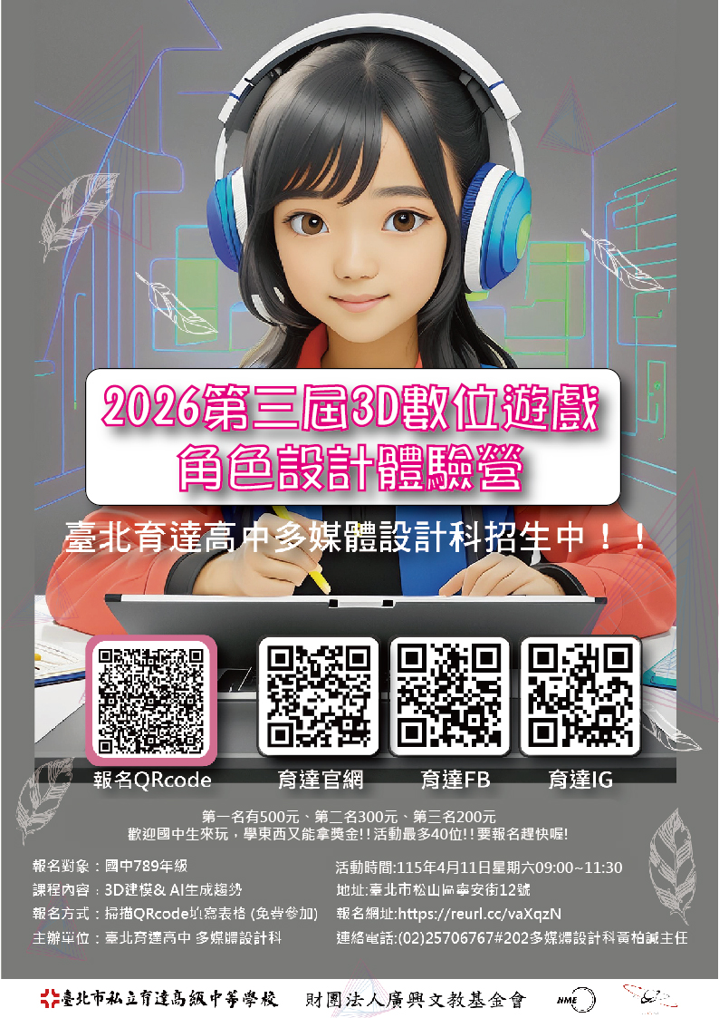 轉知-育達高中「2026第三屆3D數位遊戲角色設計體驗營」