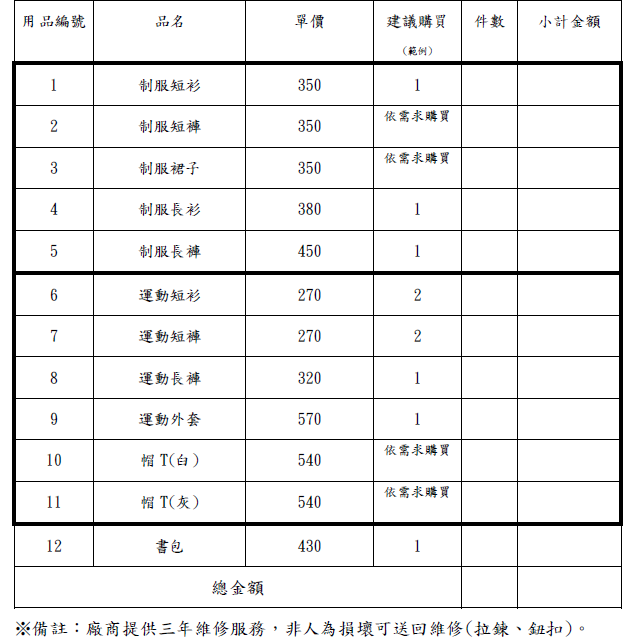 一、提供新生更換衣服尺寸或購買制服的時間:本校規劃於9月4日中午12點至下午1點。地點:本校1F多功能教室(706教室旁)
